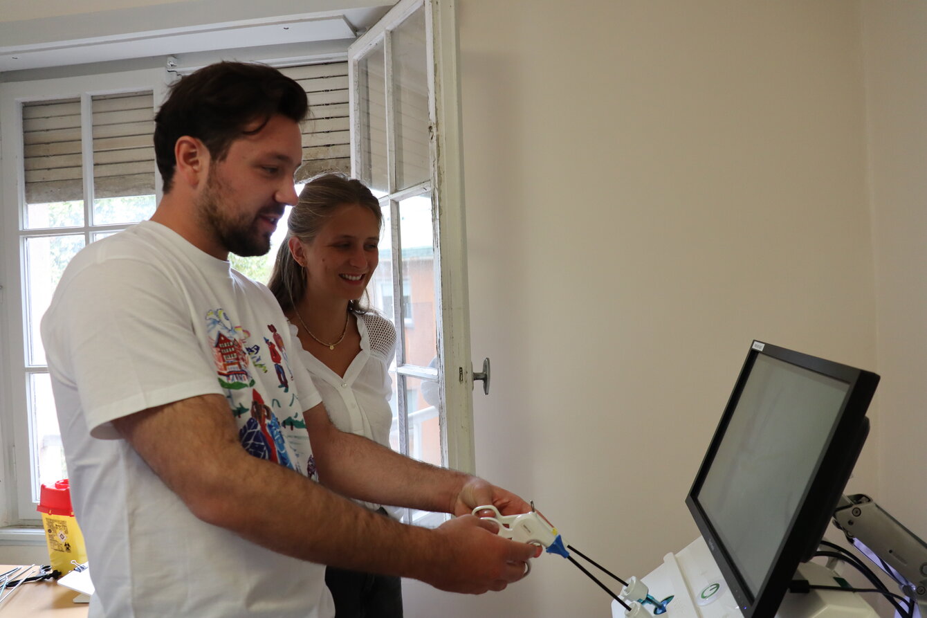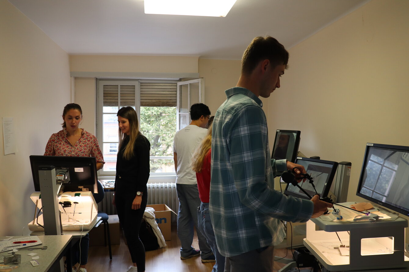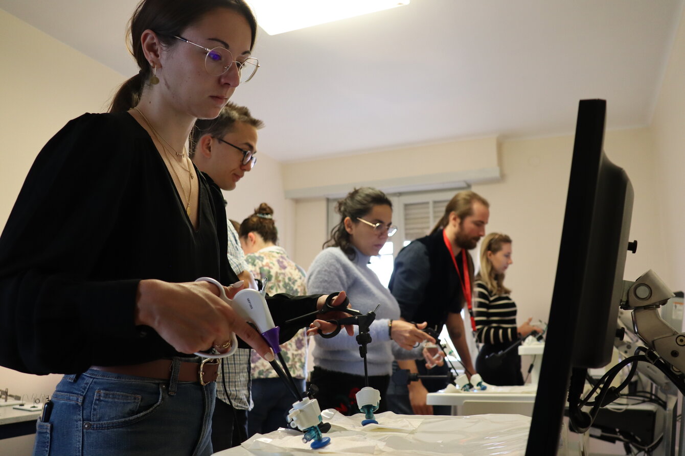 Sur les appareils de simulation de laparoscopie, les aspirants chirurgiens ont pu s’entraîner à des travaux de précision comme la manipulation de petits objets et le découpage de cercles de papier. Sous la supervision bienveillante des médecins formateurs, les mains sont devenues plus sûres et chacun avait le sourire à l’issue des différentes sessions.