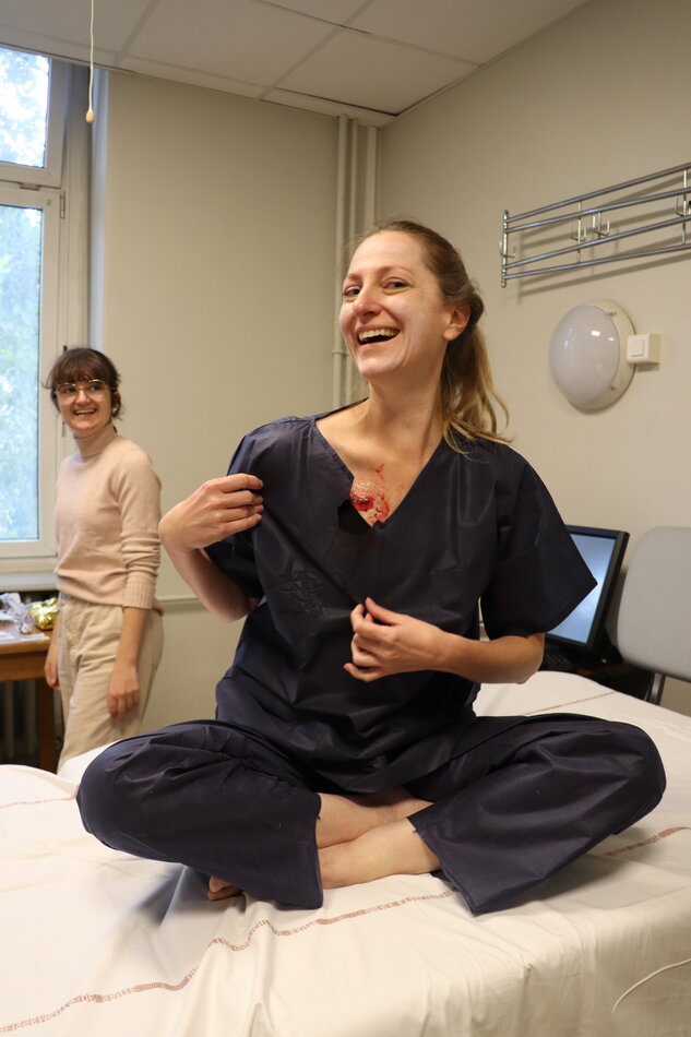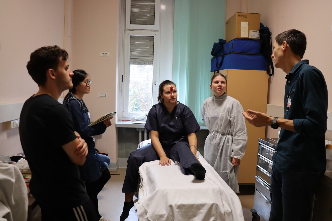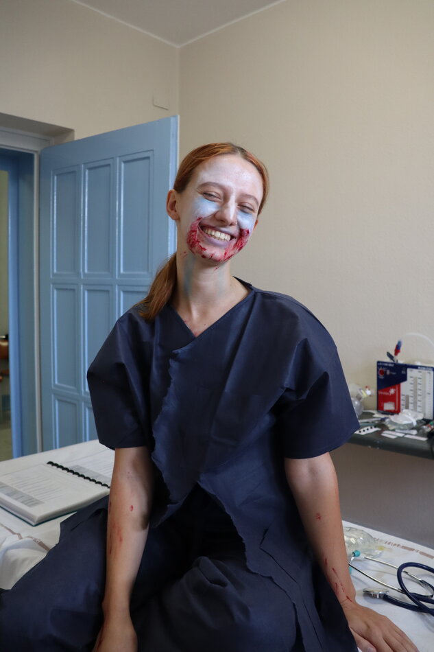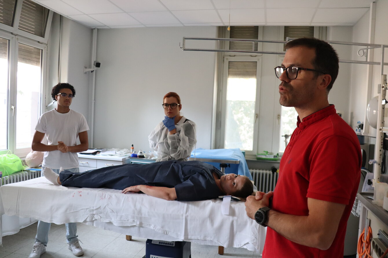 Les ateliers pratiques pour l’apprentissage ou l’entrainement à la réalisation de gestes de sauvetage (oxygénation, arrêt d’une hémorragie) ont été suivis de scénarios de simulations authentiques avec des patients simulés grimés en polytraumatisés.