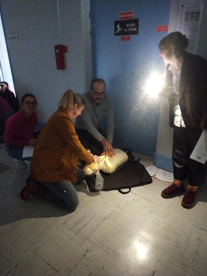 Tout était conçu pour faire monter la pression des participants pendant la simulation : session de questions-réponses, luminosité faible, matériel insuffisant et ambiance de panique. Chacun a donc pu constater par l'expérience l'intérêt de l'exercice de relaxation inséré avant le débriefing. Ce dernier a pu se dérouler dans une ambiance apaisée propice à relever des éléments pertinents.